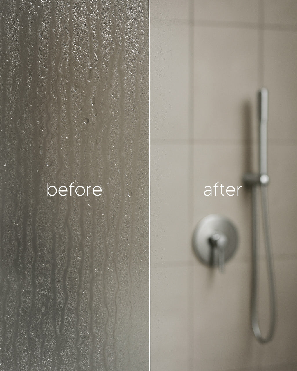 Tiles, mirrors, taps and glass doors stay crystal clear – no streaks, no watermarks, no hassle.